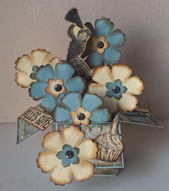 Damit sie plastischer wirken habe ich sie mit einer Schere gewölbt und an den Rändern braun gewischt. Das gefällt mir so gut, dass ich den großen Stanzer jetzt unbedingt selbst brauche - grins. Befestigt sind sie mit Schraubenbrads an Windradfolie. Die wiederum hab ich an die Zwischenstege  der Karte angetackert, so dass ich die Blumen in beliebiger Höhe platzieren kann.